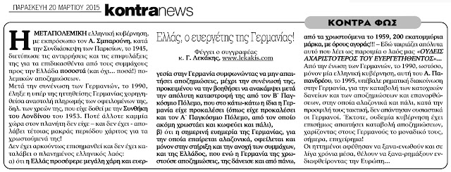 ΛΕΞΕΙΣ-ΚΛΕΙΔΙΑ: ΕΛΛΑΣ, ΕΛΛΑΔΑ, ΓΕΡΜΑΝΙΑ, ΕΥΕΡΓΕΤΗΣ, ΣΜΠΑΡΟΥΝΗΣ, ΣΥΝΔΙΑΣΚΕΨΗ ΤΩΝ ΠΑΡΙΣΙΩΝ, 1945, 1990, ΣΥΝΘΗΚΗ ΛΟΝΔΙΝΟΥ, 1953, ΓΕΡΜΑΝΙΚΕΣ ΑΠΟΖΗΜΙΩΣΕΙΣ, ΓΕΡΜΑΝΙΚΕΣ ΟΦΕΙΛΕΣ, 1959, ΠΑΠΑΝΔΡΕΟΥ, 1995, ΡΗΜΑΤΙΚΗ ΔΙΑΚΟΙΝΩΣΗ, ΚΑΤΟΧΗ, ΝΑΖΙ, Γ ΡΑΙΧ