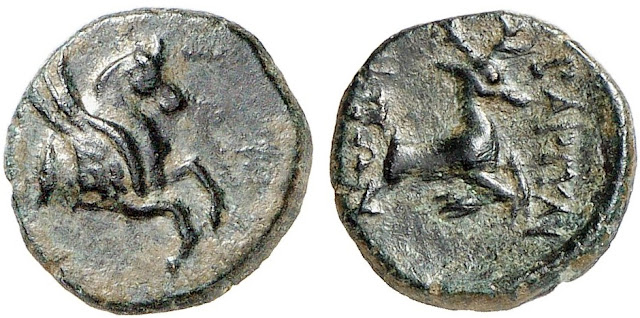 | Αρχαίο νόμισμα (του 1ου αι. π.Χ.) της Βαργυλίας, με τον πτερωτό ίππο Πήγασο και το ιερό ελάφι της Αρτέμιδος. Γράφει – ελληνικά βέβαια – ΒΑΡΓΥΛΙΩΝ. |