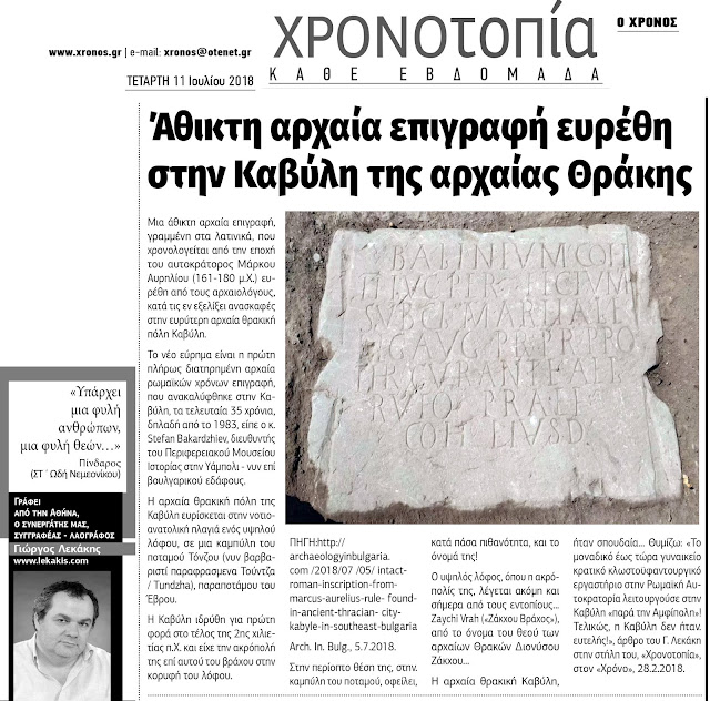 ΛΕΞΕΙΣ-ΚΛΕΙΔΙΑ: επιγραφη, λατινικα, Μαρκος Αυρηλιος, Καβυλη, Υαμπολη, Βουλγαρια, Υαμπολις, Ζαλκχου Βραχος, Ζακχος, Τουνζα, Τουντζα, ακροπολη, Θρακη, Ανατολικη Ρωμυλια, Διονυσος, καμπυλη, Τονζος, Εβρος