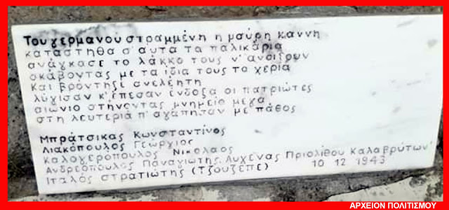 ΛΕΞΕΙΣ: Γερμανοι, καννη, λακκος, μνημειο, λευτερια, ΜΠΡΑΤΣΙΚΑΣ, ΛΙΑΚΟΠΟΥΛΟΣ, ΚΑΛΟΓΕΡΟΠΟΥΛΟΣ, ΑΝΔΡΕΟΠΟΥΛΟΣ, Ιταλος στρατιωτης, Τζουζεπε, Αυχενας Πριολιθου Καλαβρυτων, Καλαβρυτα, Αχαια, εκτελεσθεντες, εκτελεση, ηρωες, Πριολιθος Καλαβρυτων, ηρωας, ηρωο, ηρωον, κατοχη, 1943