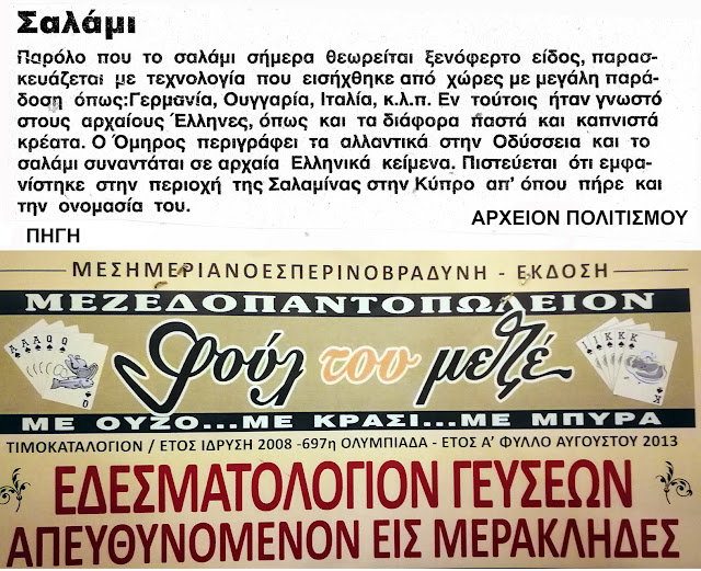 ΛΕΞΕΙΣ: σαλαμι, κατεχομενα, Σαλαμινα Κυπρου, Κυπρος, Σαλαμις, Γερμανια, Ουγγαρια, Ιταλια, παστα, καπνιστα, αλλαντικα, Οδυσσεια, Ομηρος, παστο, καπνιστο, αλλαντικο