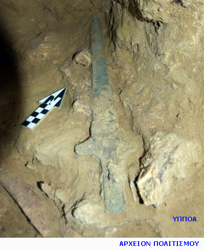 διατήρησης χάλκινο ξίφος. Στη βάση του σωρού των οστών, βρέθηκαν, επίσης,