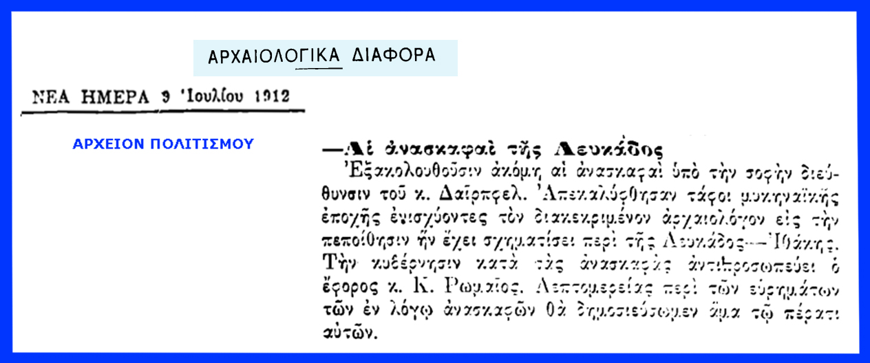 μυκηναικοι ταφοι Λευκαδα, 1912 μυκηναικος ταφος Λευκας, μυκηναικα μυκηναικη εποχη, ανασκαφη, Δαιρπφελντ, Δαιρπφελδ, Δαιρπφελ, ιθακη, αρχαιολογος Ρωμαιος, ανασκαφες