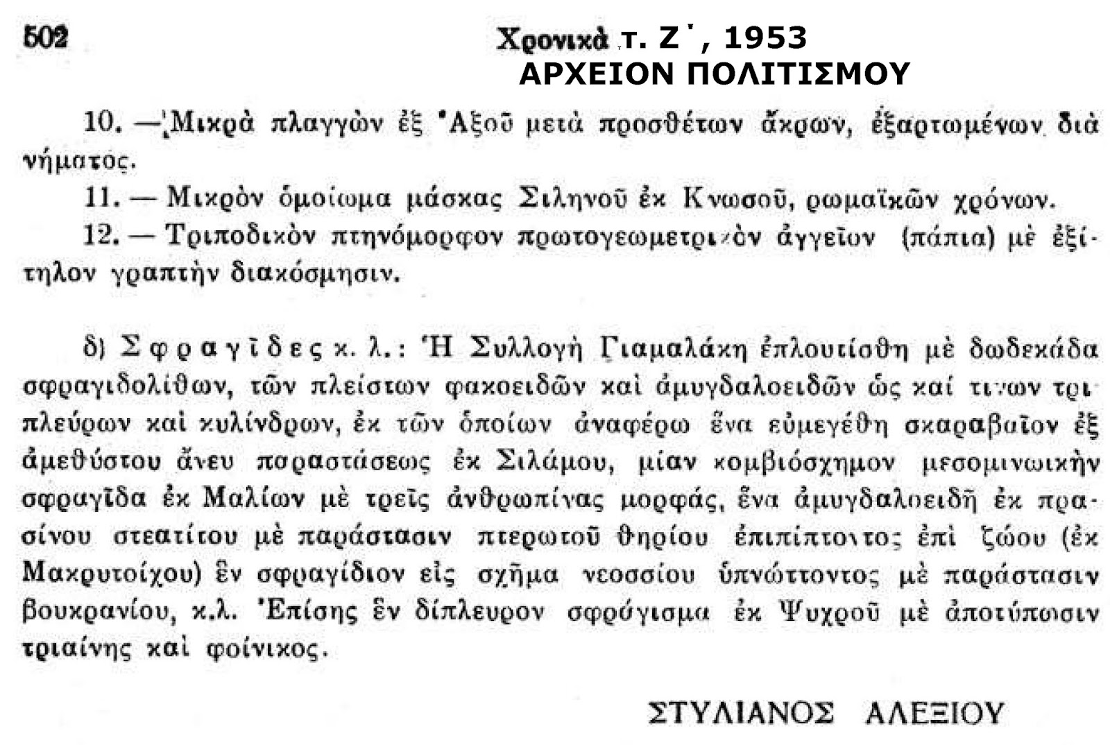 συλλογη αρχαιοτητων Γιαμαλακη, 1953 Αλεξιου συλλογη αρχαιων ιατρος Γιαμαλακης, φυλλαριο χρυσου αρχαια, νομισμα, νομισματα παιδι, παιδαριο κεφαλη αιγος, αιγα παπυρος, Βρετανικο Μουσειο αρχαιοτητες συλλεκτης συλλεκτες, σφραγιδα, σφραγιδολιθος, φακοειδης, ρομβοειδες ελασμα στοματος, στομα ανθεμια, μυκηναικη εποχη υστερομινωικό σκευος tancard αρχαικα χρονια, τανκαρντ, ψελιον ψελι κοχλιαριο, χειρουργικη αποξεση ιατρικη χειρουργειο αμυγδαλοειδης, κυλινδος, κυλινδρικος, σκαραβαιος, αμεθυστος, Σιλαμος Κρητης Κρητη, κομβιοσχημο, μεσομινωικη εποχη, Μαλια Ηρακλειου, αμυγδαλοσχημο, πρασινος στεατιτης, πτερωτο θηριο, ζωο, Μακρυτοιχος, νεοσσιος, βουκρανιο, Ψυχρο, τριαινα φοινιξ, φοινικας, διπλευρο σφραγισμα ομοιωμα, μασκα, προσωπειο σευληνος, κνωσος, τριποδικο πτηνοσχημο, πρωτογεωμετρικο αγγειο, παπια, εξιτηλος γραπτη διακοσμηση, πλαγγων, πλαγγονα, κουκλα, Αξος νημα, μελανομορφος σκυφος, ιεραπετρα Λασυθιου Λασιθιου, γονυπετης σιληνος, ανθεμιο, πυξις, πυξιδα πτερωτη Νικη, στεφανος, στεφανι λασιθι, λασυθι, κρατηρ, κρατηρας, αρμα ιππεας διωτο Μεσσαρα Μεσαρα σιγμοειδες σιγμα προχους, προχοη σπηλαιο mouthpiece σπηλαιωδης ταφος Κυπαρισσιου κυπαρισσι ψευδοστομος αμφορευς αμφορεας Αδελε Ρεθυμνης, γεωμετρικο καλπη καλαθοειδη αγγεια μαιανδρος, ζατρικιο ημικυκλιο, ροδαξ ροδακας ρομβος τριγωνιδιο Απεσωκαρι, κερνος, πλαιδιο, τρητη λαβη, οψιανος, οψιδιανος λεπιδα φαιστος, εργαλειο λεπτουργου, λεπτουργος λυχνος, λατρευτικος πελεκυς, λεκανη, μινωικος κοπευς, Πεδιαδα, διπλος πελεκυς αωτο, χαλκινο ηλος, καρφι, χρυσα κοσμηματα, αρχαια κοσμηματοποιια ενωτια, ενωτιο περιστερι, ζευγος περιστεριων περιστερια, σκουλαρικια συρμα, κοκκιδωτη εργασια, 3ος πΧ αιωνας, γορτυς, γορτυνα Ολους Ελουντα Αρχαιολογικο Μουσειο Ηρακλειου