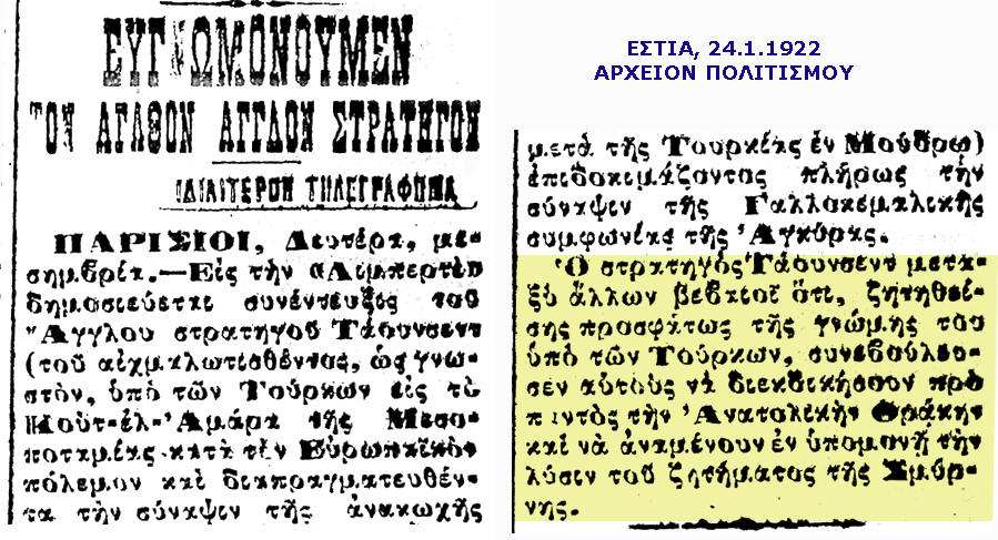 Αγγλος στρατηγος Ταουνσεντ, Τουρκοι, τουρκια, Ανατολικη Θρακη 1922 λυση ζητημα Σμυρνη, αιχμαλωτος, Κουτ ελ Αμαρα, Μεσοποταμια, ευρωπαικος πολεμος, ανακωχη, μουδρος λημνου, λημνος, γαλλια, γαλλοι γαλλοκεμαλικη συμφωνια Αγκυρας, αγκυρα, κεμαλ