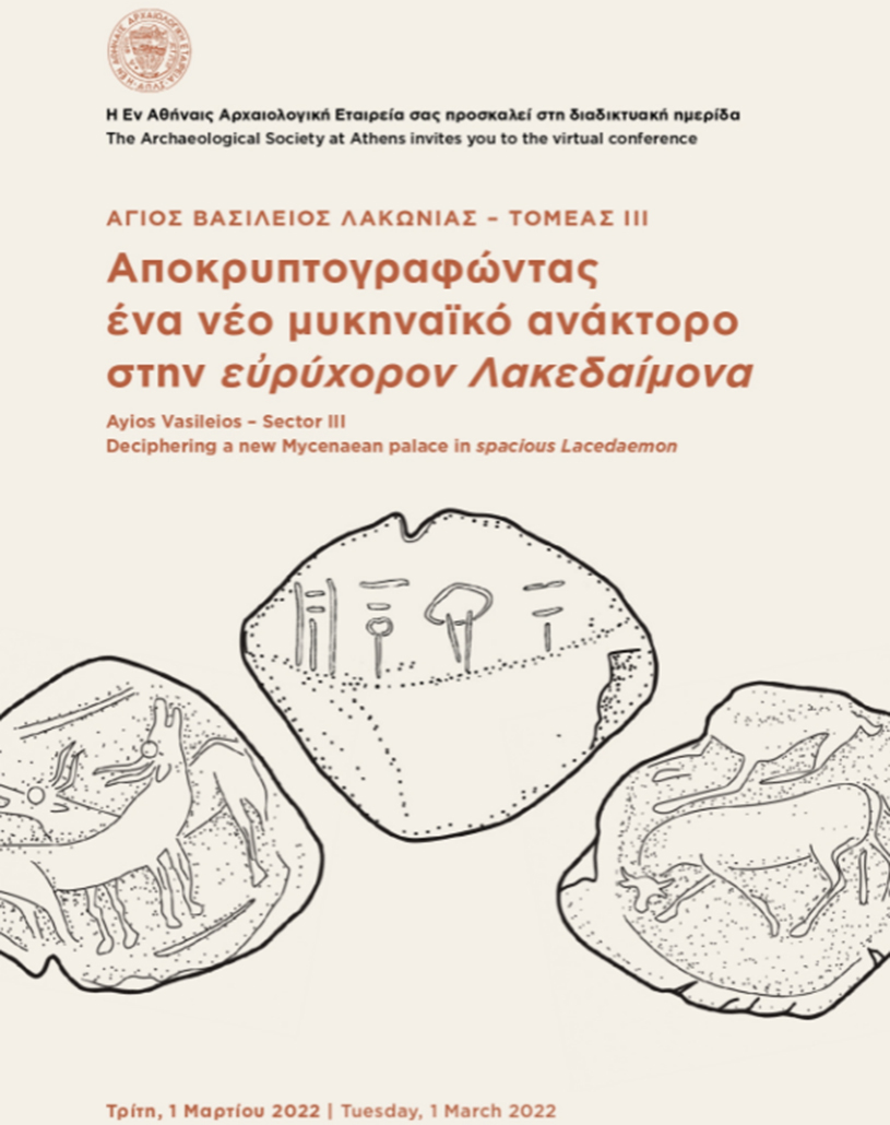 Την ΤΡΙΤΗ, 1 ΜΑΡΤΙΟΥ 2022 και ώρα 9:30 π.μ. – 2 μμ θα γίνει διαδικτυακό σεμινάριο με θέμα: «Αγιος Βασίλειος Λακωνίας. Τομέας ΙΙΙ. Αποκρυπτογραφώντας ένα νέο μυκηναϊκό ανάκτορο στην ευρύχορον Λακεδαίμονα».