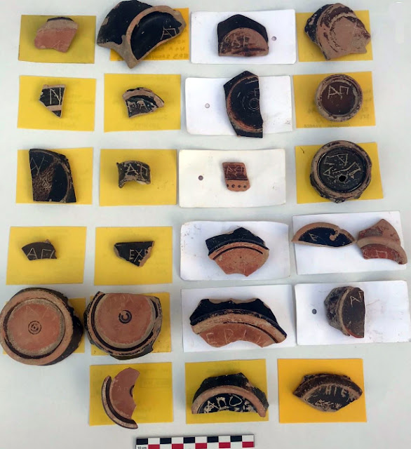 | Ευρέθησαν ενεπίγραφα όστρακα, σκύφοι, λεκανίδες, όλπες, μεταλλικα αντικείμενα, μαγειρικά σκεύη…. |
