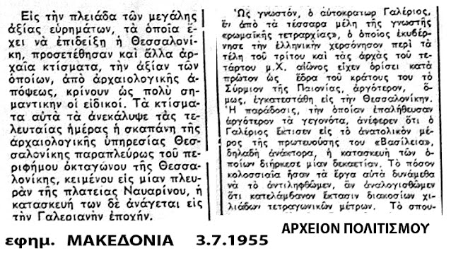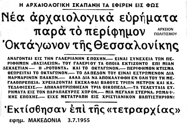 αρχαιολογικα ευρηματα, περιφημο Οκταγωνον Οκταγωνο Θεσσαλονικης χριστιανικο βαπτιστηριο Βουργουντζης 1955 αρχαια Θεσσαλονικη γαλεριος βασιλεια βασιλειες ροτοντα ιν αγιου γεωργιου δαπεδο μαρμαρινη πλακα ανασκαφες ανασκαφη κατεδαφιση απαλλοτριωση ευρημα στερνα ρωμαικη εποχη ρωμαικα ρωμαικο λευκος πυργος κισντερνα 8γωνο 8 οκτω Οκταγωνικο κτηριο αρχαιο κτισμα ανακτορο γαλεριου ανακτορα αγιος γεωργιος ψηφιδωτο ιπποδρομος εγνατια οδος μνημειακη τοξον τοξο 3ος 4ος αιωνας μΧ τετραρχια συρμιο συρμιον παιονιας παιονια πλατεια ναυαρινου