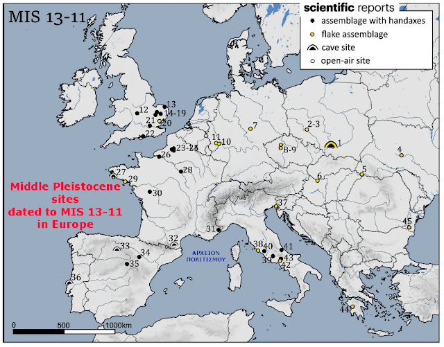 1. Tunel Wielki Cave; 2. Trzebnica 2; 3. Rusko 33, 36 & 42; 4. Medzhibozh 1; 5. Korolevo; 6. Vértesszölös 2; 7. Bilzingsleben; 8. Račinĕves 9. Karlštejn-Altán; 10. Miesenheim I; 11. Kärlich-Seeufer; 12. Waverly Wood; 13. Happisburgh Site 1; 14. Warren Hill; 15. High Lodge; 16. Beeches Pit; 17. Hoxne;18. Elveden; 19. Barnham; 20. Clacton-on-Sea; 21. Swanscombe; 22. Boxgrove; 23. Cagny-la-Garenne; 24. Ferme de l’Epinette; 25. “Rue de Cagny”; 26. Saint-Pierre-les-Elbeuf; 27. Menez Dregan; 28. La Celle; 29. St. Colomban; 30. La Grande Vallé; 31. Terra Amata; 32. Arago; 33. Atapuerca Galeria; 34. Aridos; 35. Ambrona; 36. Gruta da Aroeira; 37. Visogliano 38. Ficoncella; 39. Fontana Ranuccio; 40. Castel di Guido; 41. Valle Giumentina; 42. Isernia-la-Pineta; 43. Guado San Nicola; 44. Marathousa / ΜΑΡΑΘΟΥΣΑ– ΠΕΡΙΣΣΟΤΕΡΑ για τηνΜΑΡΑΘΟΥΣΑ, ΕΔΩ; 45. Dealul Guran
