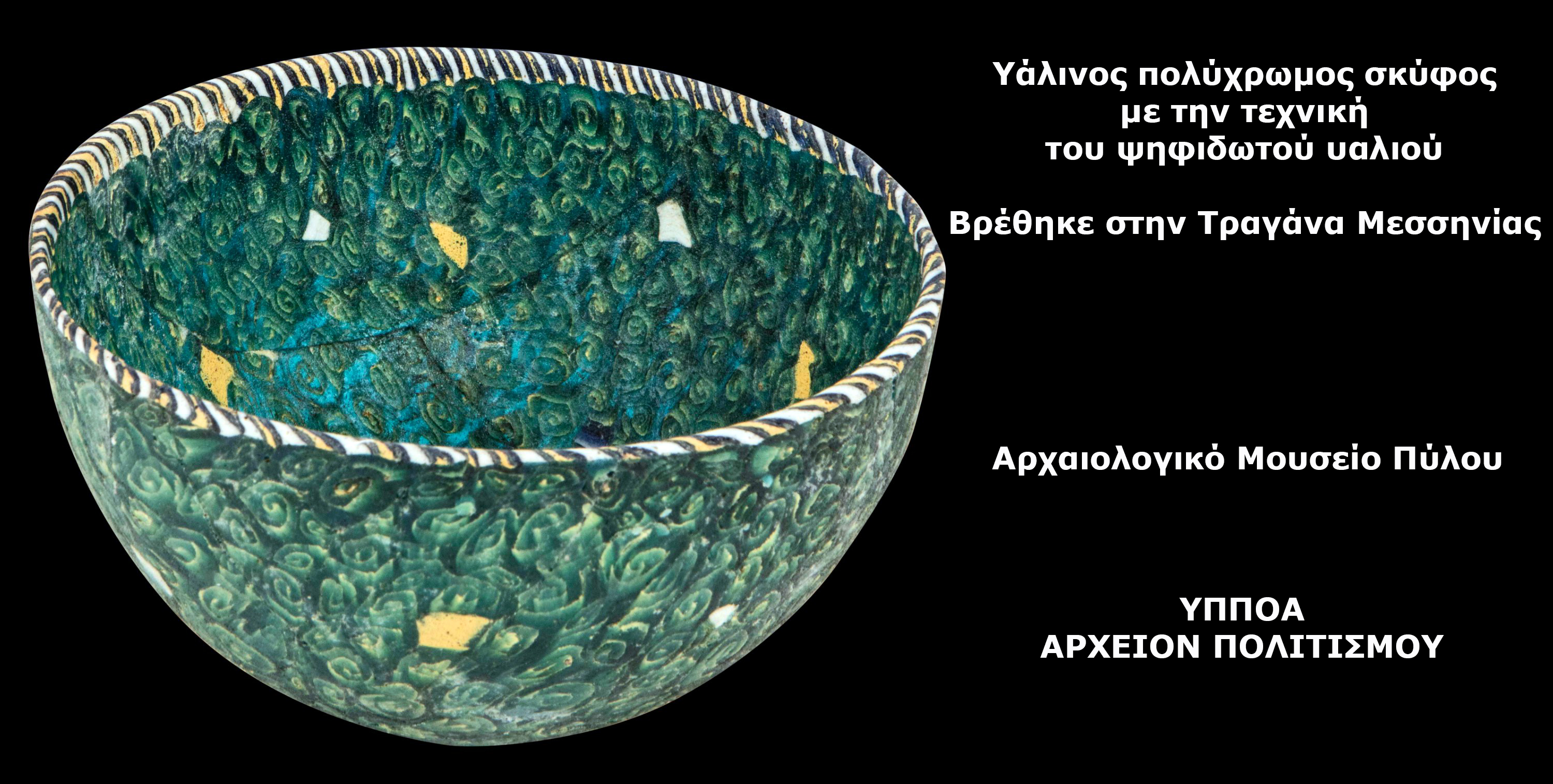 Υαλινος πολυχρωμος σκυφος, τεχνικη του ψηφιδωτου υαλιου Τραγανα Μεσσηνιας ΕΚΘΕΜΑ Αρχαιολογικο Μουσειο Πυλου πυλος υαλι ψηφιδωτο χιλιανθες, millefiori 3ος – 1ος αιωνας πΧ λακκοειδης ταφος θεση Ραχη του Τσοπανη Μεσσηνια γυαλινος γυαλιου γυαλι