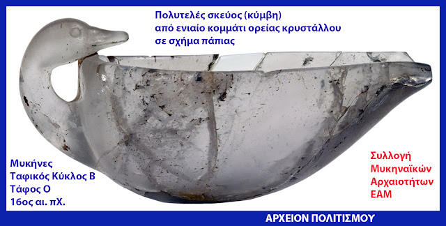 Αυτό το πολυτελές σκεύος (λέγεται κύμβη[1]), φιλοτεχνημένο από ενιαίο κομμάτι ορείας κρυστάλλου(!), σε σχήμα πάπιας, ευρέθη στις Μυκήνες, στον Τάφο O, του Ταφικού Κύκλου Β, και είναι του 16ου αι. π.Χ.!