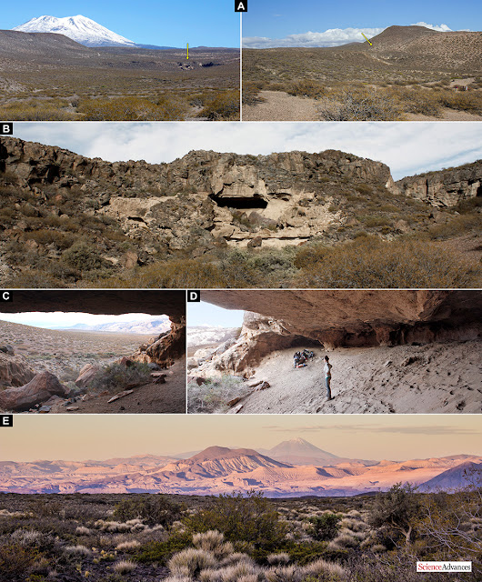 CH1 environment and landscape: (A) Emplacement of CH1 (yellow arrow) in a volcanic landscape within the Monte Desert. (B to D) Views of the cave’s geology and topography. (E) View from CH1 of the volcanic landscape of northwestern Patagonia. Photo credits: G.R.V.