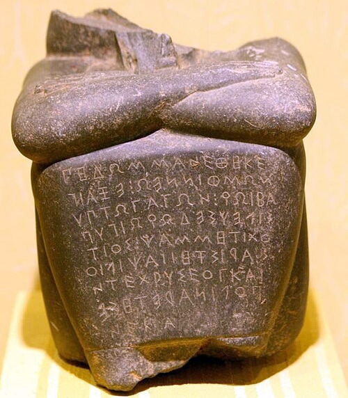 στα ελληνικά βρέθηκε και διαβάστηκε στο αριστερό πόδι του κολοσσιαίου καθιστού
