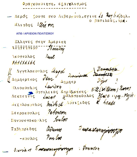 Λερος Λιβερπουλ, λε ροι ρου Le Roy Φραγκοποιηση εξαγγλισμος ελληνικων επιθετων ελληνικο επιθετο ελληνικα επιθετα Τριανταφυλλιδης φραγκοι αγγλοι βασιλεας βασιλιας ελληνες Αμερικη Αναστασιου στανλευ στανλει Stanley χειρογραφη σημειωση ελληνικη αγγλικη γλωσσα οικογενειακο ονομα Σταθης, Αριστοτελειο Πανεπιστημιο Θεσσαλονικης, Ινστιτουτο Νεοελληνικων Σπουδων, Ιδρυμα Τριανταφυλλιδη Αρχειο Γλωσσικο, οικογενειακα ονοματα οικογενεια Ιστορικο Αρχειακη Συλλογη ταβλαριδης παπαπαναγοπουλος πανουτσοπουλος πετροπουλος μιχαλοπουλος λεκατασας ηλιοπουλος δημητρατος αγγελοπουλος αποστολος