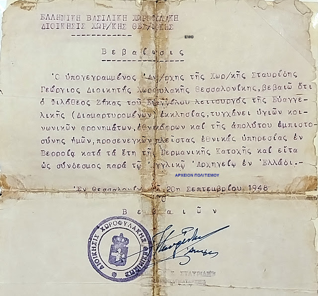Βεβαιωσις, Βεβαιωση υγιη κοινωνικα φρονηματα εθνικοφροσυνη απολυτος εμπιστοσυνη ΕΛΛΗΝΙΚΗ ΒΑΣΙΛΙΚΗ ΧΩΡΟΦΥΛΑΚΗ ΔΙΟΙΚΗΣΙΣ ΧΩΡΟΦΥΛΑΚΗΣ ΘΕΣΣΑΛΟΝΙΚΗΣ Αντισυνταγματαρχης Σταυριδης Διοικητης Θεσσαλονικη Ζηκος λειτουργος Ευαγγελικη εκκλησια Διαμαρτυρομενοι πιστοποιητικο υγιων κοινωνικων φρονηματων, εθνικοφρων εθνικες υπηρεσιες Βερροια βεροια ημαθιας ημαθια Γερμανικη Κατοχη γερμανια συνδεσμος αγγλικο Αρχηγειο Ελλαδος ελλαδας ελλαδα αγγλια 1948