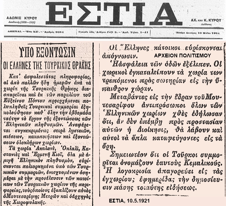 ΠΗΓΗ: εφημ. «Εστία», 10.5.1921. ΑΡΧΕΙΟΝ ΠΟΛΙΤΙΣΜΟΥ, 10.5.2021.