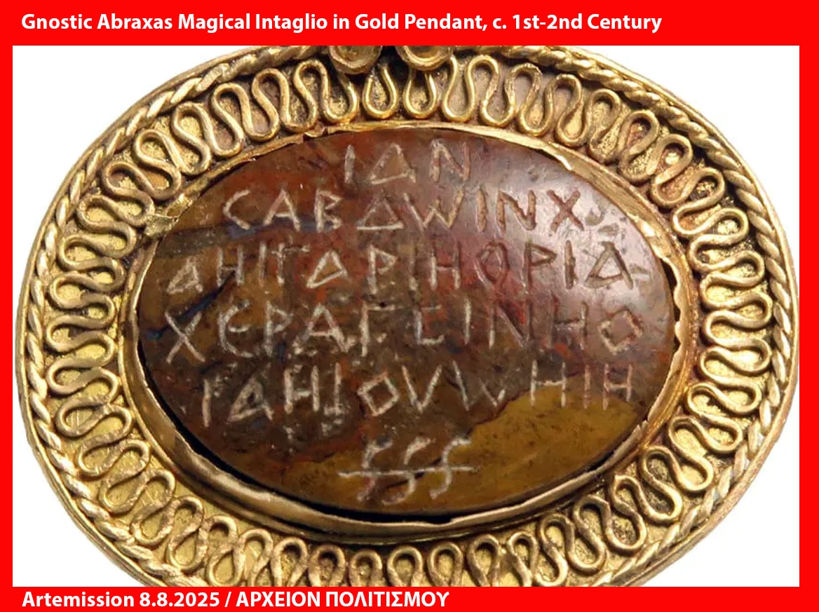 Διότι ξεπουλιέται σε δημοπρασία ένας Abraxas, γνωστικό μαγικό με βαθυτυπία σε χρυσό οβάλ μενταγιόν, του 1ου – 2ου αιώνα μ.Χ.! Πρόκειται για πολύ σπάνιο γνωστικό έγγραφο κείμενο, με κόκκινη βαθυτυπία. Χωρισμένο σε 6 σειρές, χαραγμένες με ελληνικά γράμματα. Το μέγεθός του είναι 3,6 εκατ. Υλικό: Χρυσός και κόκκινος γρανατης, συνολικό βάρος 9,8 γραμμ. Η Προέλευσή του, λένε οι ξεπουλητάδες, είναι από «ιδιωτική συλλογή Ηνωμένου Βασιλείου, που αποκτήθηκε πριν από το 2000»… (αοριστίας το ανάγνωσμα)… Το ανεκτίμητον, εκτιμάται 3.500 λίρες Αγγλίας! Η δημοπρασία θα γίνει στις 8.8.2025. από την… Artemission στο Λονδίνο…