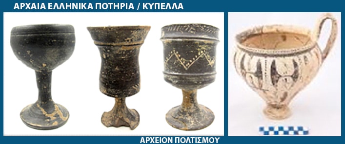 Μυκηναϊκό μεγάλο κύπελλο με πολύ λεπτή βάση και μεγάλο άνοιγμα (φωτ. επάνω δεξιά). Είναι κατασκευασμένο από ανοιχτόχρωμο πηλό και φέρει διάκοσμο που διατάσσεται σε δύο ζώνες. Στην επάνω ζώνη, που είναι και μεγαλύτερη, κυριαρχούν οι διπλοί πελέκεις, που χωρίζονται με στικτές γραμμές. Μικρότερα μοτίβα κοσμούν την χαμηλότερη και λεπτότερη ζώνη. Η λαβή είναι λεπτή και ψηλή, με ραδινή ανάπτυξη. – ΠΗΓΗ: ΕΘΝΙΚΟ ΚΕΝΤΡΟ ΤΕΚΜΗΡΙΩΣΗΣ. Άρα το κύπελλο είναι πανάρχαιο σκεύος, αφού έχουμε και κύπελλο μυκηναϊκής περιόδου.