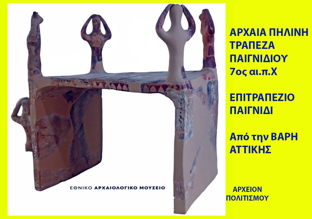 Το πήλινο ομοίωμα τράπεζας παιγνιδιού (7ου αι. π.Χ.) προέρχεται, από ταφική πυρά, που απεκαλύφθη στο νεκροταφείο του αρχαίου Δήμου του Αναγυρούντος – στην περιοχή της σημερινής Βάρης Αττικής.