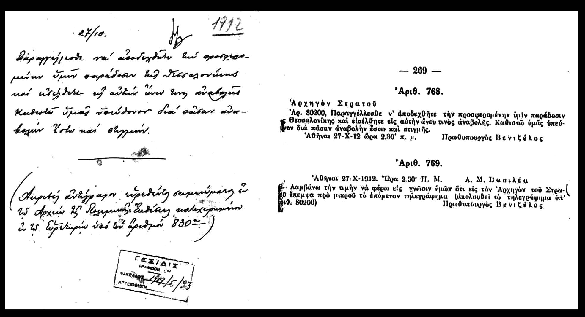 Στέλνει τότε ο Βενιζέλος το (παραπάνω) τηλεγράφημα (αρ. 80200): “Παραγγέλεσθαι να αποδεχτείτε την προσφερόμενην υμιν παράδοσιν της Θεσσαλονίκης και να εισέλθετε εις αυτης ανευ χρονοτριβής. Καθιστώ υμας υπεύθυνον δια πάσαν αναβολήν, έστω και στιγμής”.