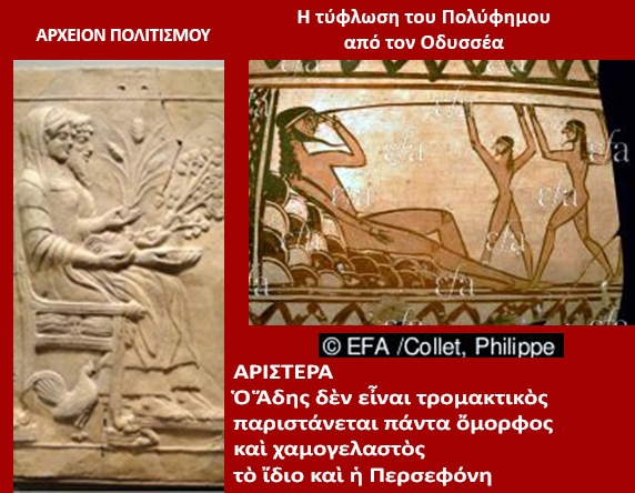 Ὁ Ἅδης δὲν εἶναι τρομακτικὸς – οἱ ξένοι τὸν εἰκονίζουν τρομακτικὸ ἕως σατανικό, οἱ Ἕλληνες ποτέ – παριστάνεται πάντα ὄμορφος καὶ χαμογελαστὸς, τὸ ἴδιο καὶ ἡ Περσεφόνη δίπλα του καὶ τὰ σύμβολα τοῦ Κάτω κόσμου δὲν εἶναι οἱ ἀράχνες ἀλλὰ ὁ ἀλέκτωρ (κόκκορας) καὶ τὸ στάχυ, τὰ ὀποῖα ἔχουν πολύ βαθεῖς συμβολισμούς. Γιὰ ἐμᾶς τοὺς Ἕλληνες τὰ ὁστᾶ εἶναι ἱερὰ καὶ δὲν τὰ περιφέρουμε ὅπως οἱ βάρβαροι, οὔτε τὰ κάνουμε γιρλάντες, ἀντιθέτως δίδουμε τὴν ζωή μας γιὰ νὰ τὰ διαφυλάξουμε. Ὅλα αὐτὰ δὲν τὰ ἔπρατταν ἀπὸ συντηρητισμὸ, ἀλλὰ ἐπειδὴ γνώριζαν τὴν βαθιὰ παιδευτικὴ ἀξία τοῦ ΚΑΛΛΟΥΣ. Γι΄αὐτὸ φρόντιζαν ὅλα νὰ ἔχουν κάλλος , ἀκόμα καὶ τὰ “τέρατα”.