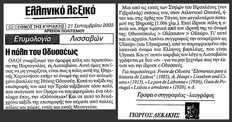 ετυμολογια Λισσαβωνας Λισσαβωνος Λισσαβων / Ulissipo πολη ιδρυση Οδυσσεας / Ulysses Ατλαντικος ωκεανος Λεκακης Λισαβωνας Λισαβωνος Λισαβων πορτογαλιας πορτογαλια Λισσαβωνα Λισαβωνα Λισσαβονα Λισαβονα πολις ιδρυτης Οδυσσευς / Ulysses πρωτευουσα οχθη ποταμος Ταγος εμπορικη βιομηχανικη ευρωπη Ιβηρικη χερσονησος ονομα πολυμηχανος βασιλευς βασιλιας Ιθακης, ιθακη Οδυσσειακη ταξειδι ταξιδι επιστροφη Τροια, αρχαιος ελλην ελληνας ηρωας ηρως ποιητης ομηρος εγγονος επος, Οδυσσεια δεκαχρονο 10χρονο πλανο χρονοδιαγραμμα εμπορικος δρομος εμποριο αρχαιοι ελληνες περιπετεια πλανη Μεσογειος θαλασσα Στηλες Ηρακλεους ηρακλη ηρακλης Γιβραλταρ σταση οχθες μεγαλυτερος Ιβηρια Οδυσσοπολις Οδυσσοπολη Οδυσσουπολις Οδυσσουπολη Ολισσιπον Ολισσιπο Ολισιπον Ολισιπο Olissipo Λατινος συγγραφεας Ulissipo ουλισιπο ουλισιπονα ουλισσιπο ουλισσιπονα Ulyssipona παραφραση λατινικα ουλυσες ουλυσσες Ulysses Πορτογαλοι, ορθογραφια δυο σ σιγμα Lisboa λισμποα Λισμπον, Γαλλοι Lisbonne, αγγλοι Lisbon, Ιταλοι Lisbona, λισμπονα ειδυλλιακη περιοχη Ηλυσια Πεδια Λισαβον ελληνικα ελληνικη αποικια Λυσιτανια, Λουσιτανια Λυζιτανια, Λουζιτανια Μινχο Αιμινιον, Αιμινιο ολιβειρα Oliveira χαουπτ Haupt Στραβων στραβωνας Γεωγραφια, ιταλια Σικελια σημειο ναος αθηνας ιερον ιερο θεα αθηνα Τρωικος πολεμος