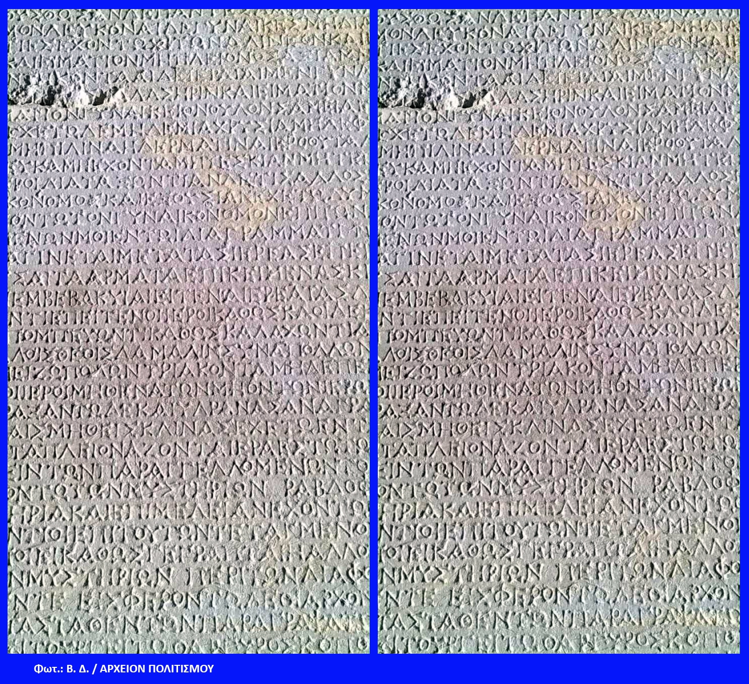 Για τις πηγές που είναι καθορισμένες από τα έγγραφα ως αγνές, καθώς και για τις πηγές των αγαλμάτων, την φροντίδα να έχει ο Μνασίστρατος όσο ζει και να μετέχει μαζί με τους ιερείς στις θυσίες και στα μυστήρια. Επί πλέον τα δέρματα από τα αφιερώματα να τα παίρνει ο Μνασίστρατος.