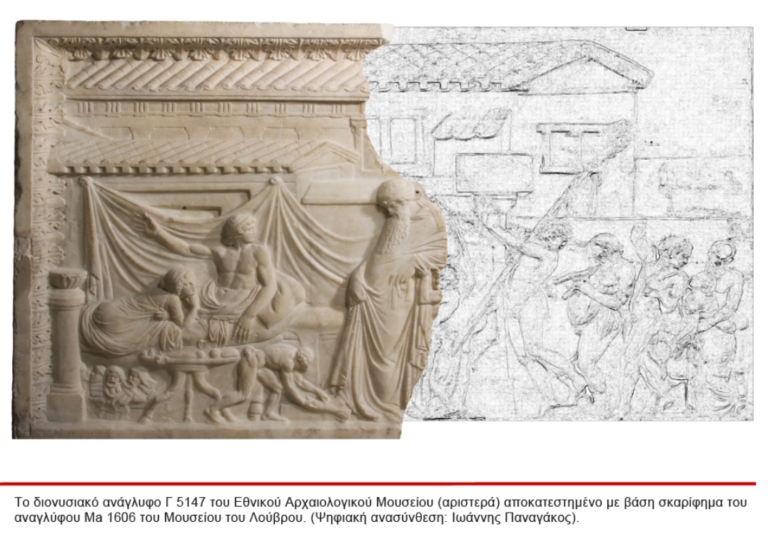 Θεος, υπο την επηρεια μεθης κρασιου Θεοι κρασι αθηνα κλεισοφος 510 6ος αγγειο αρχαιο αναγλυφο, κοσμημενο περιτεχνο πλαισιο, μορφη πινακας εντοιχιση τοιχοδομια κτηριο δημοσιο διακοσμητικο διακοσμηση απεικονιη ανακεκλιμενος, στεφανωμενος στεφανι στεφανος νεος ανδρας, τυπος ηρωας συμποσιαστης χειρονομια καλωσορισμα δεξι χερι κεφαλι θεικη δεξια ποδι κλινη ξαπλωμενη μπρουμυτα συντροφος του, επισκεπτης ζευγαρι συμποσιαστες τραπεζα αρχαιο τραπεζι αρχαια εδεσματα θρανιο ειλητος ρολος παπυρος θεατρικο προσωπειο συμποσιαστης αρχαιος ποιητης μεγαλοπρεπης θεος Διονυσος Σαρδαναπαλος κεφαλη σατυρος σανδαλι αιθριο ιδιωτικη οικια πλουσια αυλαια, σκηνη θεικη επιφανεια αρχιτεκτονικη βαθος πεδιου αποκατασταση μουσεια Λουβρο, Βρετανικο Μουσειο, Ναπολι συνοδεια Διονυσου, τεσσερις 4 ορχουμενοι σατυροι μαιναδα παρασταση δημιουργια νεοαττικο εργαστηριο 2ος αιωνας 100 πΧ κλασσικη σκηνη ηρωικο δειπνο επισκεψη θεου θιασος θεοξενεια θνητος μουσικος ανδρας ερμηνεια κειμενα ρωμαικη γραμματεια ονομα ονομασια Ikarionrelief, ελληνικη μυθολογια αττικος ηρως Ικαριος, ιερο Διονυσος Αττικης, Ηριγονη δεξιωση ανταλλαγμα δωρο αμπελι αττικη Διας ζευς Σεμελη φυση βλαστηση Μαιναδες εκστατικος χορος θεατρο ακολουθοι υμνος οργυιαστικος οργιο οργυιο φρενιτιδα λογικη ανθρωποι συμποτικα τραπεζια απολαυση συμποσιο χαλαροτητα ευθυμια Πλατωνας πλατων απελευθερωσησυμποσια αναστολη υπερβαση ορια οριο διαθεση γλεντοκοπος θιασος γλεντι κωμος θορυβωδης τροπος, τρεκλισμα μεθη μεθυσμενος εκσταση μουσικο οργανο ζωηρη ερωτικη ερως ερωτας διονυσιακο εαμ Εθνικο Αρχαιολογικο Μουσειο – Συλλογη εργο Γλυπτικη δωρεα Στρειτ 1ος μΧ Τσουλη, διονυσιακα αναγλυφα Αρχαιολογια σαρκοφαγος συμπλεγμα μεθυσμενος υποβασταζομενος ζευγος Ερωτιδεις Ερωτιδευς θυρσος θυρσοφορος ζωγραφος του δινου δινος 420 410 5ος πραξιτελης 325 300 4ος
