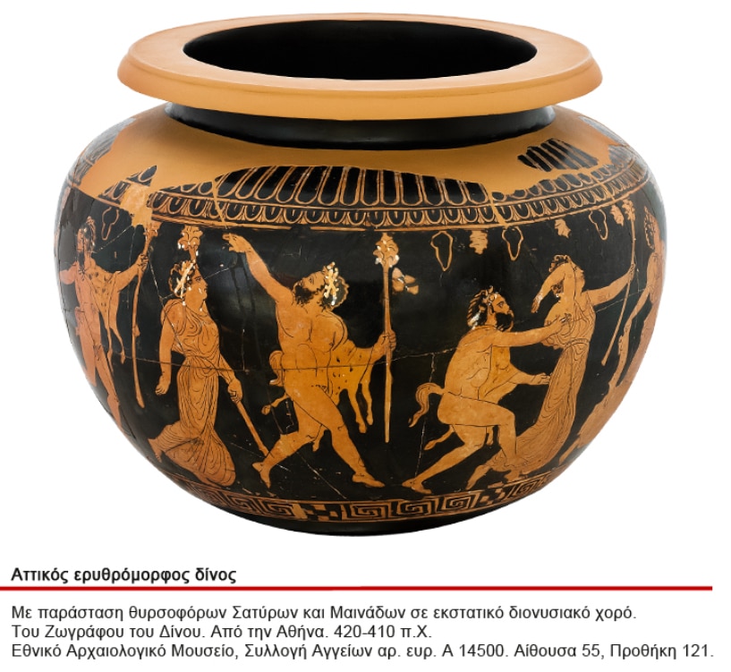 Ο Διόνυσος, γιος του Δία και της Σεμέλης, ήταν ο θεός της φύσης, της βλάστησης, του αμπελιού και του κρασιού, των Μαινάδων, του εκστατικού χορού και του θεάτρου. Υπό την επήρεια του κρασιού οι ακόλουθοί του τον υμνούν οργυϊαστικά με μια φρενίτιδα πέρα από το λογικό, ενώ οι άνθρωποι τον μνημονεύουν στα συμποτικά τραπέζια.