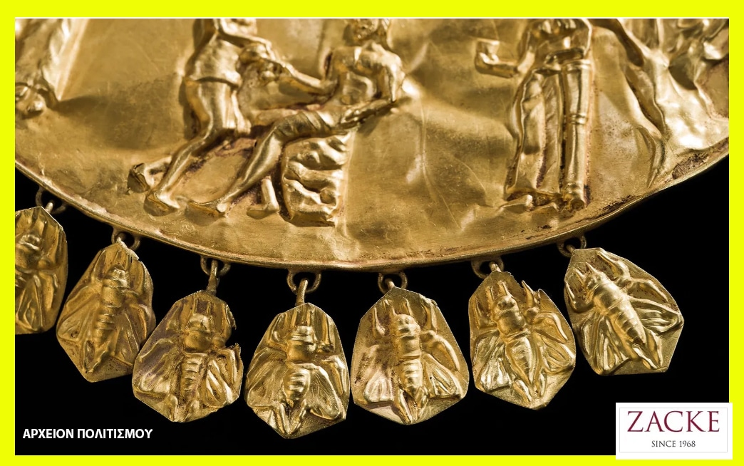 Ανήκει στην λεγομένη ελληνική τέχνη της Γανδάρας – ΠΕΡΙΣΣΟΤΕΡΑ για την τέχνη Γκαντάρα, ΕΔΩ – περίπου του 2ου – 1ου αιώνα π.Χ. Κόσμημα σε σχήμα ημισελήνου, λεπτοδουλεμένης κατασκευής, από σφυρήλατο χρυσό φύλλο, που καταλήγει σε θηλιές-κογχύλια. Οκτώ χρυσές χάντρες, διακοσμημένες με μέλισσες[1], κρέμονται στο κάτω μέρος…