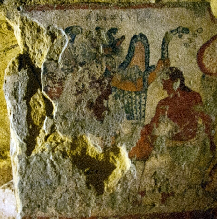 Ο Τάφος του Όρκου Β’ (ή απλώς «Τάφος του Όρκου») του 325 π.Χ. στον πίσω τοίχο απεικονίζει τον Θησέα και τον Πειρίθοο να κάθονται σε ένα τραπέζι στον δεξιό τοίχο, παίζοντας ένα επιτραπέζιο παιγνίδι, όπου απειλούνται από τον ετρουσκικό δαίμονα Τουχούλχα (παραπάνω φωτ.), ο οποίος εμφανίζεται με μυτερά αυτιά, τριχωτό πρόσωπο και αγκυλωτό ράμφος, κρατώντας φίδια στα χέρια του. Ο τάφος είναι μοναδικός, καθώς περιέχει την μόνη γνωστή ιστορική απεικόνιση αυτού του δαίμονα.