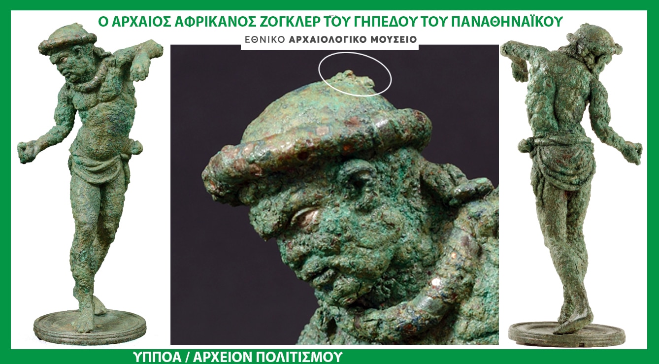 αρχαιος Αφρικανος ζογκλερ Γηπεδο Παναθηναικου αρχαιοι Αφρικανοι Παναθηναικος Αφρικη ακεραιο οξειδωμενο διατηρηση αρχαιο χαλκινο αγαλματιο αναπαρασταση ωριμος ανδρας, στιγμιαια δυναμικη κινηση κορμος δεξια ελικοειδης συστροφη κεφαλι βραχιονας σκελος ρυθμος ισορροπια σωμα ημιγυμνος, πτυχωτο περιζωμα κομπος γλουτος χορευτης χορευτικη φιγουρα δακτυλα δεξι χερι μικρη σφαιρα συγχρονισμενες κινησεις χερια εναλλαγη αερας, ταινια ενθετη αργυρη διακοσμηση ανθινο στεφανι υποθυμιδα λαιμος διακριτικα γνωρισματα χαρακτηριστικα προσωπο ψηλολιγνα σκελη Αιθιοπας, εθνοτικη φυλη αρχαιοι ελληνες τεχνη βλεμμα διαπεραστικο ενθετο ασημι κογχη ματι βαρυ ταλαιπωρημενο καματος ειδος χορευτες θαυματοποιος δεξιοτεχνης διασκεδαστης δημοσιος χωρος ιδιωτικο συμποσιο ελληνιστικη ρεαλισμος εικονα κοσμοπολιτισμος ετερογλωσσοι υπηκοοι εθνοτητα πολυειδεις συνηθειες μεγαλουπολη Ανατολη Αιγυπτου διασκεδαση μορφη θεικο ηρωικο προτυπο ζωη βιωμα εμπειρια στυλ καλλιτεχνικη ποιοτητα εργο αλεξανδρινο εργαστηριο 2ος αιωνας πΧ χαλκουργος, αξιοζηλευτος ψυχογραφος χαλκος συναισθημα αγαλματιδιο εαμ Εθνικο Αρχαιολογικο Μουσειο – Συλλογη εργα Μεταλλοτεχνιας, Αμπελοκηποι Αθηνας 200 – 150 3ος σφαιροπαικτης χαλκο βαρβαροι συμποσιο συμποσιακο τελετουργικο χορου δακτυλοκροτημα δακτυλα μεσος αντιχειρας παλαμη επαγγελματιας θεαμα υποθυμιδες Αθηναιος Δειπνοσοφισται Πλουταρχος Συμποσιακα Προβληματα συντελεστης συμποσια συμποτης, μουσικος, υπηρετικο προσωπικο ανθος αρωμα ευωδια ατμοσφαιρα, ενταση μεθη στεφανωμα συνδεση θειο στοιχειο ιερος εθιμο αττικη αγγειογραφια 5ος 4ος ιωνια πηλινο ειδωλιο Ταραντας Μεγαλη Ελλαδα κατω ιταλια Μυρινα Μικρα Ασια Ιλιαδα ιλιας αμεμπτος αμυμονας αιθιοπες κατοικοι Ωκεανος θεος Διας ζευς θεοι αθανατος τρανη θυσια Ηροδοτος βιβλιο μαυροι λιβυκες φυλες, μεγαλη ερημος Ομηρος, γλωσσα μαλλια εκστρατεια Καμβυσης κατακτηση Περσης αυτοκρατορας μακροβιοι μακροβιος Λιβυη, νοτια θαλασσα πιο υψηλοσωμοι γιγαντες γιγαντας γιγας πιο ομορφοι ομορφοτεροι ανθρωποι εικαστικα φυλετικα ξενοι μαυρος απεικονιση ταυτοποιηση σκουρο χρωμα δερμα μαλλι κλασσικη ακραιες διαφορες βαρβαρος ελληνιστικος κοσμος πολιτισμοι στυλιστικο μορφολογικο ελληνιστικα χρονια πηλινα ειδωλια Βοιωτια Altes Museum Antikensammlung Βερολινου βερολινο γερμανια γυμνος νεος σφαιριδιο λαιμος συλλογη αρντ Arndt Γλυπτοθηκη Μοναχου μοναχο γερμανιας Μεμφιδα Μεμφις Μουσειο Μπενακη, στεφανος καλλιτεχνικα εργαστηρια Αλεξανδρεια μνημειακη δημιουργια επιμελημενη αποδοση μικρο μαρμαρο λιθος, στουκο stucco πηλος χυτευση λεπτομερεια αργυρη βολβος ματια ρεαλιστικη αποδοση ανατομια σωμα κατασκευη αττικα αυτοκρατορικα 1ος μX αττικη αθηνα αντιγραφο μικρογραφια μεταπλαση περιοδος λακκος εκσκαφη Εταιρεια Υδατων αττικος ερυθρομορφος χους κλινη εταιρα αρπα ζωγραφος της ερετριας θεατρο διουνυσου 425 420 αυλος αυλητης μουσικος αλογο ιππος ιπποκομος μαστιγιο 4ος πλαστικο ερετρια ευβοια 6ος