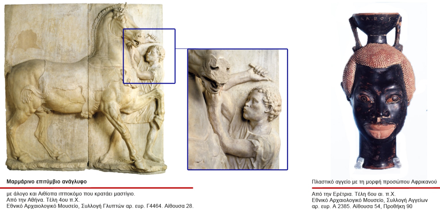 [5] Με αυστηρές εικαστικές συμβάσεις αποδίδονται τα φυλετικά χαρακτηριστικά των «ξένων» στην αρχαία ελληνική τέχνη, όπως ακριβώς και των μαύρων Αφρικανών ή Αιθιόπων, απεικονίσεις των οποίων σώζονται σήμερα. Το κύριο χαρακτηριστικό για την ταυτοποίηση των Αιθιόπων στην αρχαιότητα ήταν το σκούρο χρώμα του δέρματος, τα χαρακτηριστικά του προσώπου και τα μαλλιά. Επισημαίνεται ότι η κλασική τέχνη επικεντρώθηκε στις ακραίες διαφορές μεταξύ Ελλήνων και βαρβάρων – δηλαδή, όλων των μη Ελλήνων. Ωστόσο, ο ελληνιστικός κόσμος έφερε τους Έλληνες σε πολύ στενότερη επαφή με πολλούς διαφορετικούς πολιτισμούς.