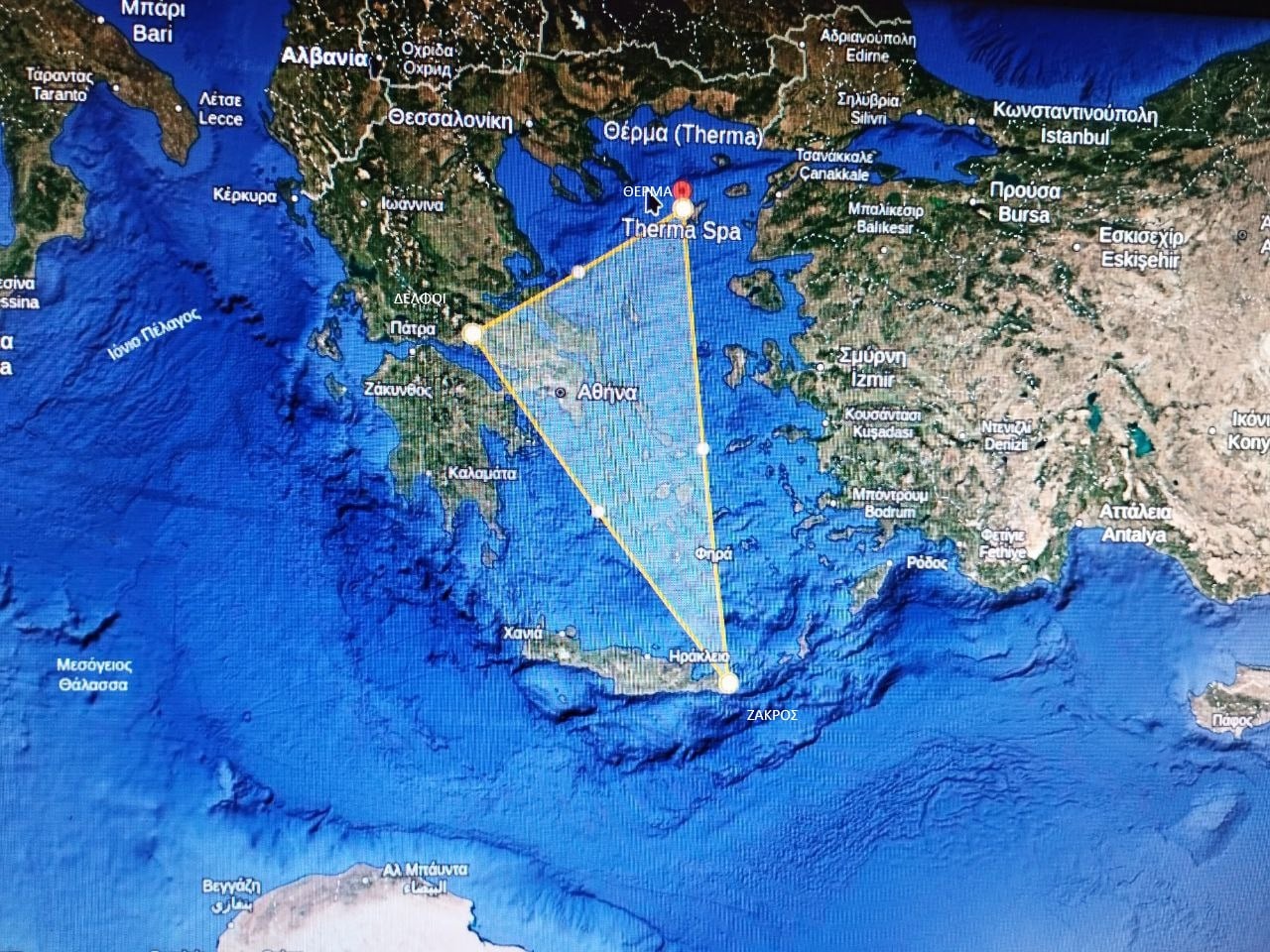 Πράγματι οι μετρήσεις Google Earth έδιδαν εξ αρχής τιμές διακεκριμένου σκαληνού τρίγωνου… Σε επαναλήψεις μετρήσεων στο τρίγωνο πηγών Ζάκρου – Κασταλίας – Θέρμων Λήμνου, καθώς και στο τρίγωνο πηγών Ζου – Ζάκρου – Ζήρου… ελάμβανα διαφορετικές διακριτές τιμές, σε βαθμό που ο μετρητής Google Earth έμοιαζε με μετρητή «Χρηματιστηρίου αξιών»…