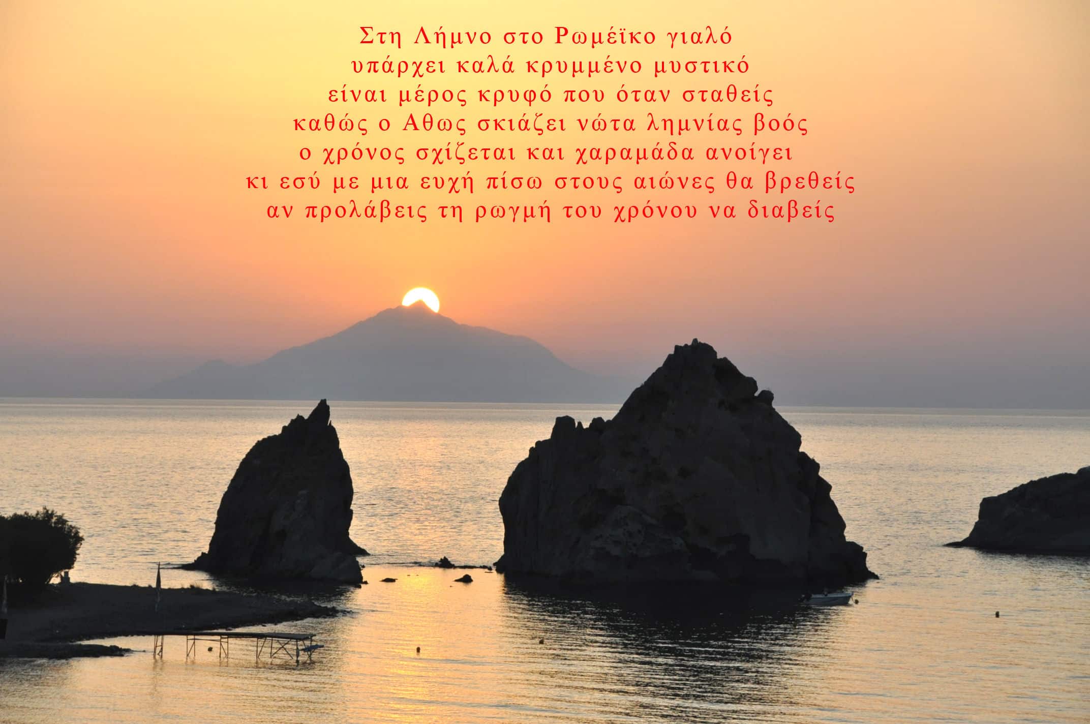 Ο ήλιος δύει πίσω από την κορυφή του Άθωνος… Λένε ότι οι ταμιευτήρες του Άθου (ή ίσως και του Ολύμπου) τροφοδοτούν τις πηγές στα Θέρμα Λήμνου… – ΣΧΟΛΙΟ Γ. Λεκάκη: Θυμηθείτε ότι από τον Όλυμπο εκσφενδόνισε ο Ζευς τον Ήφαιστο, και αυτός προσγειώθηκε στην Λήμνο… Έτσι συνδέεται η Λήμνος και με τον Όλυμπο. Τα Θέρμα κοντά στο χωριό Κορνός (= Κορωνος, κορώνα, στέμμα > κρουνός) είναι κτισμένα στο όρος του σήμερα λέγεται Προφήτης Ηλίας. Στην κορυφή του υπήρχε αρχαίος ναός. Στην θέση του κτίσθηκε εκκλησάκι του Προφήτη Ηλία. Στο πανηγύρι του πολλοί Λημνιοί, οι οποίοι ανεβαίνουν με τα πόδια από την παραμονή και διανυκτερεύουν εκεί πάνω. Λίγο πιο πάνω και τα Θέρμα Σαμοθράκης αμφότερα στον 25ο κάθετο (γεωγραφικό μήκος) – ΔΙΑΒΑΣΤΕ επίσης: Γ. Λεκάκη “Ταματα και αναθηματα”. Και “ΣΑΜΟΘΡΑΚΗ, ιερά νήσος”. Και “Οι 755 γνωστές ιαματικές πηγές της Ελλάδος”.