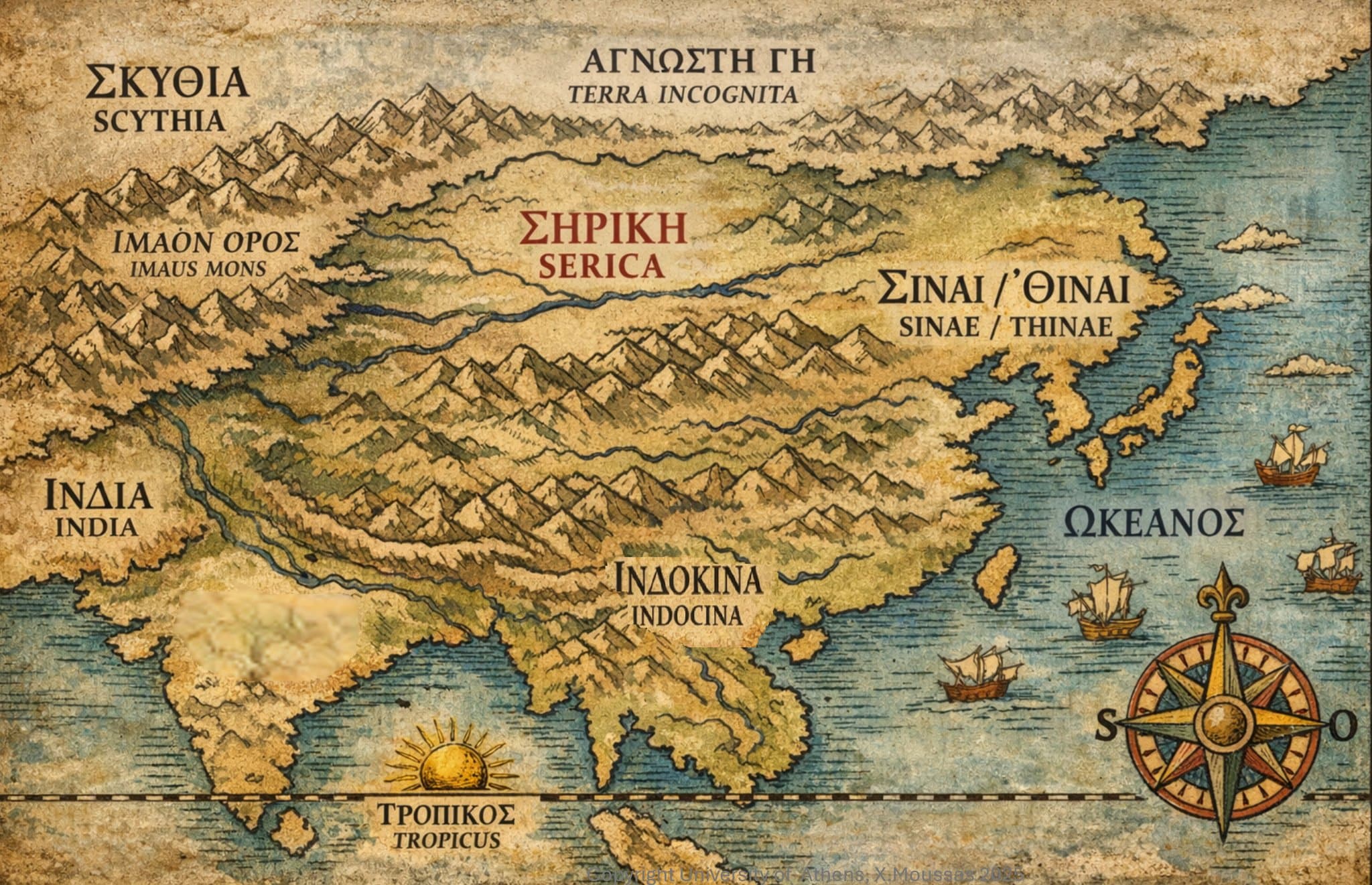 ΣΚΥΘΙΑ (SCYTHIA) – ΑΓΝΩΣΤΗ ΓΗ (TERRA INCOGNITA) – ΙΜΑΟΝ ΟΡΟΣ (IMAUS MONS) / Ιμαλαια – ΣΗΡΙΚΗ (SERICA) < Σηρες – ΣΙΝΑΙ / ΘΙΝΑΙ (SINAE / THINAE) Κινα > Σινες / Θινες / Κινεζοι – ΙΝΔΟΚΙΝΑ (INDOCINA) – ΙΝΔΙΑ (INDIA).