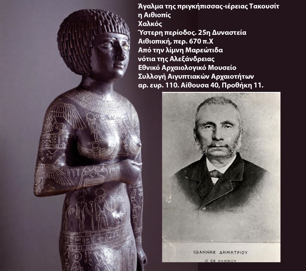 Δημητριου ευεργετης Λημνος δωρο δωρεα αρχαια αντικειμενα αρχαιος αιγυπτιακος πολιτισμος εαμ Εθνικο Αρχαιολογικο Μουσεοο πτολεμαικα νομισματα Νομισματικο Μουσειο Αθηνων χαλκινο αγαλμα πριγκηπισσα ιερεια Τακουσιτ, Αιθιοπις αιθιοπια Χαλκος υστερη περιοδος εποχη 25η Δυναστεια Αιθιοπικη 670 7ος αιωνας πΧ λιμνη Μαρεωτιδα, Μαρεωτις Αλεξανδρεια συλλογη αιγυπτιακων Αρχαιοτητων ευεργετες Λημνου, αιγυπτος πτολεμαιοι μακεδονες νομισμα Αιγυπτου οικογενεια ασχολια επαγγελμα καλλιεργεια εμποριο βαμβακι περιουσια ευποροι Λημνιοι ιδρυση σχολειο ανεγερση εκκλησια αγαθοεργια νησι 19ος αιωνας μχ 1886, Λημνιακη Αδελφοτητα Αλεξανδρειας οικονομικη ανορθωση Ελλαδα ευεργεσια επιφανεις Ελληνες Αιγυπτιωτες λατρης αρχαιολογια συλλεκτης αρχαιοτητων αρχαιο οικονομικη ευρωστια 1880 αιγυπτιακη συλλογη Αρχαιολογικη Εταιρεια αναγορευση Επιτιμιος Προεδρος εκθεση Πολυτεχνειο, εμπ ανεγερση Βασιλικο Διαταγμα ΒΔ Εφημεριδα Κυβερνησεως ΦΕΚ 28 Σεπτεμβριου 1890 Σεπτεμβριος διακοσμηση Γερμανος αρχιτεκτονας καβεραου Kawerau, ονομασια Αιθουσα Αιγυπτιακων Αρχαιοτητων Ιωαννου Δημητριου του εκ Λημνο προτομη 2008, επανεκθεση ιστορια αρχαιοκαπηλια