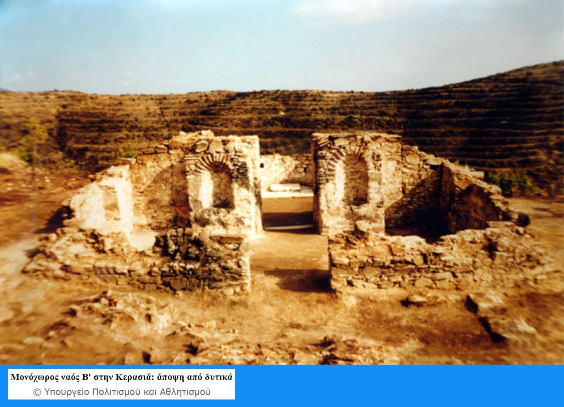 • Ναός Α της Κερασιάς. Βρίσκεται 500 μ. περίπου δυτικά του εγκαταλλειμένου σήμερα οικισμού της Κερασιάς. Είναι μικρός μονόχωρος τρουλλαίος ναός με μεγάλη προεξέχουσα ημικυκλική κόγχη και μεταγενέστερο νάρθηκα με πλινθόστρωτο δάπεδο. Η είσοδος, το μαρμάρινο κατώφλι της οποίας σώζεται στην θέση του, ανοίγεται στην δυτική πλευρά. Ο τρούλος στηρίζεται με την βοήθεια τεσσάρων τόξων και ισαρίθμων σφαιρικών τριγώνων στους περιμετρικούς τοίχους που σχηματίζουν εσωτερικά το σχήμα του σταυρού.