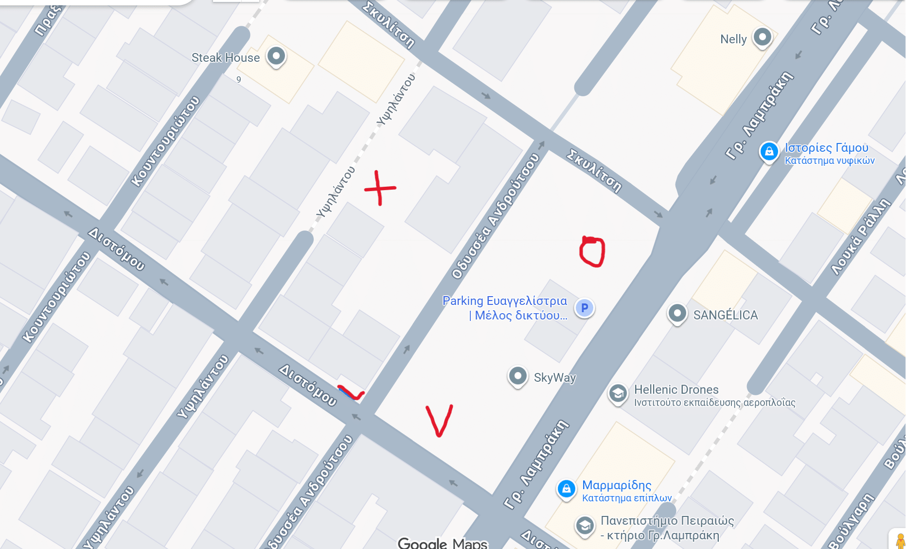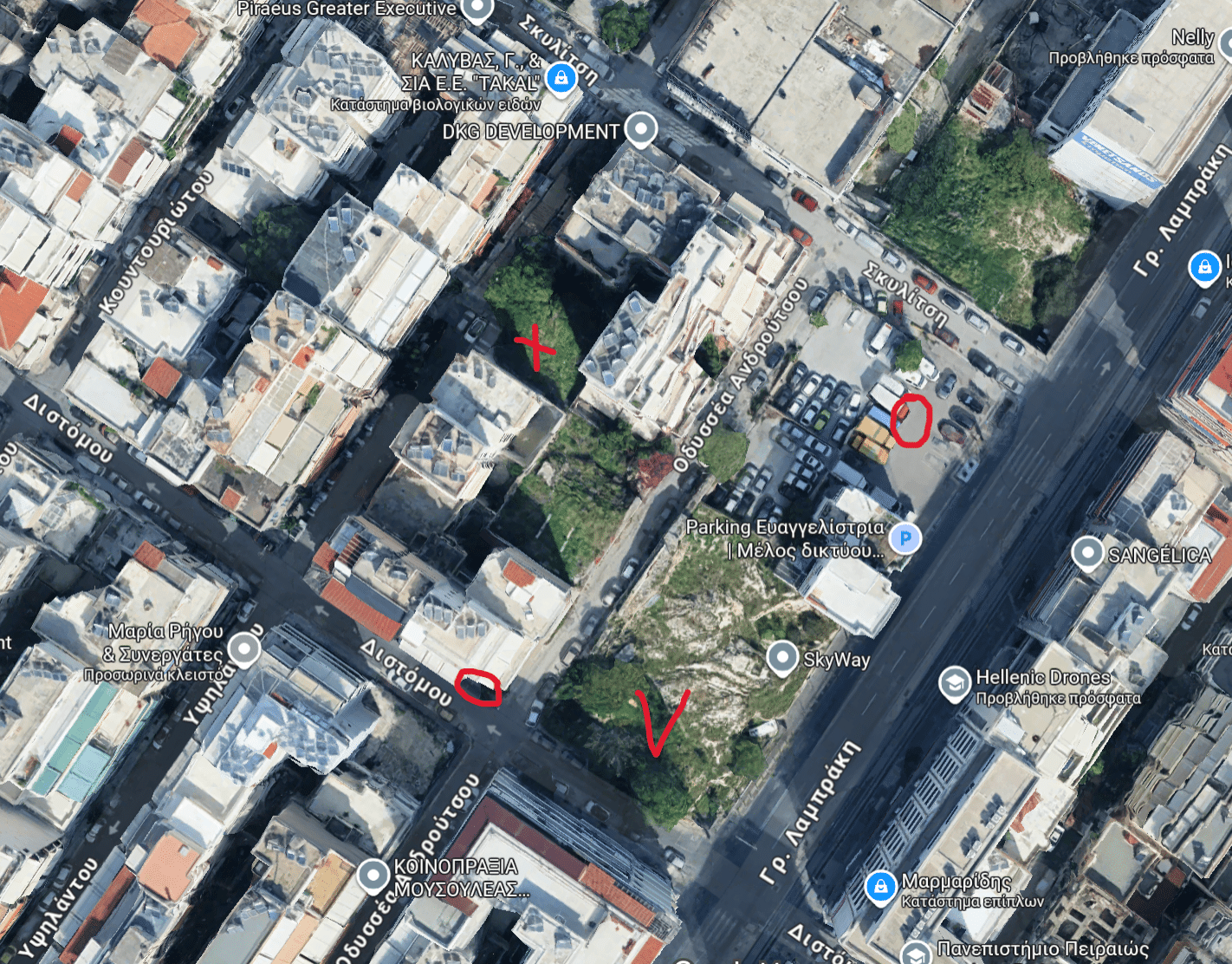 Στην διασταύρωση των οδών Διστόμου και Ανδρούτσου σημειώνεται με κόκκινο σημάδι η πολυκατοικία που κτίσθηκε προ δεκαετίας περίπου, και στην οποία έχουν αφήσει άνοιγμα στην πυλωτή, για να υπάρχει πρόσβαση στο υπόγειο όπου επίσης έχουν βρεθεί αρχαία. Στην διασταύρωση των οδών Γρ. Λαμπράκη – Διστόμου – Ανδρούτσου σημειώνεται με V το ακίνητο, όπου λειτουργούσε ο θερινός κινηματογράφος «ΑΝΕΣΙΣ» μέχρι τις αρχές του 2000 περίπου – ΔΕΙΤΕ το ΕΔΩ.