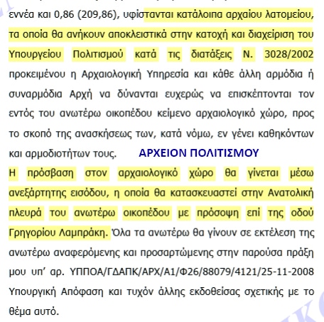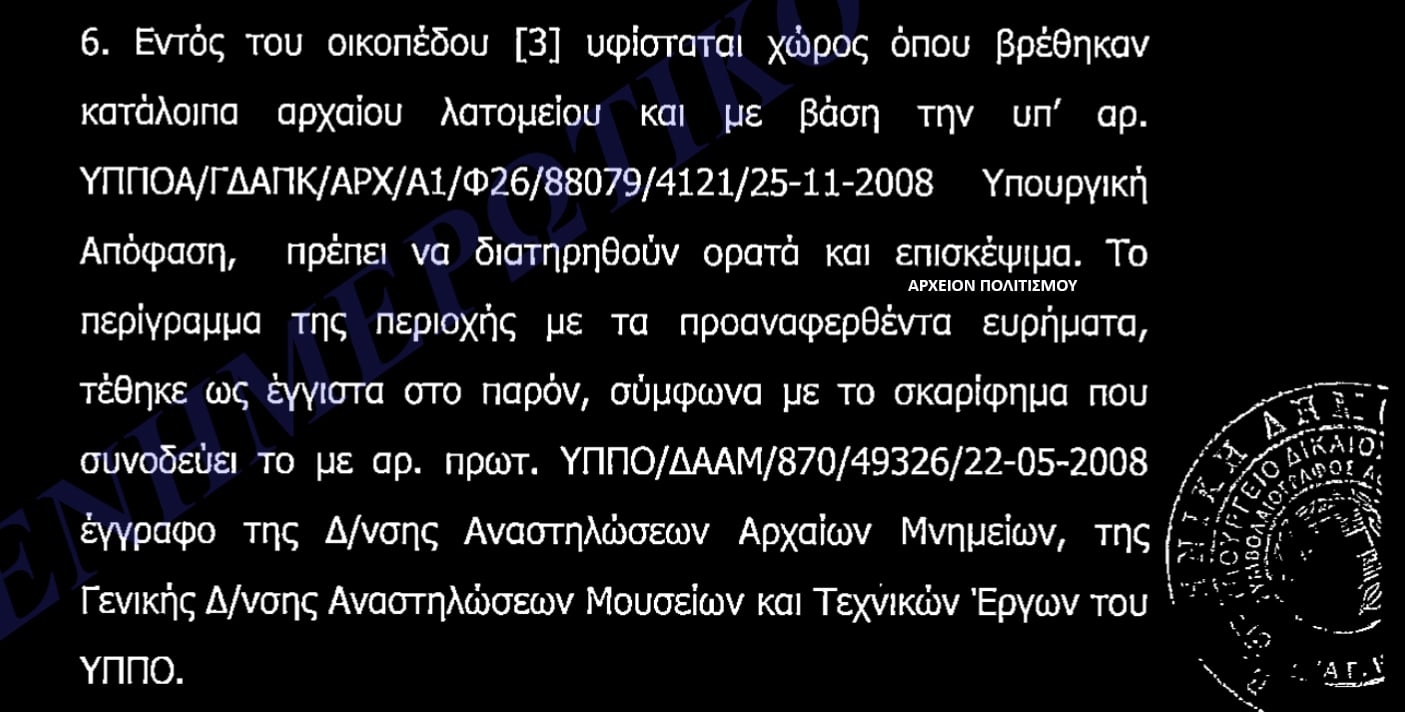 Ήδη από το συμβόλαιο αγοράς αναφέρεται ότι στο συγκεκριμένο ακίνητο υπάρχουν αρχαιολογικά ευρήματα – λένε πως είναι αρχαίο λατομείο. Παρά ταύτα εκδόθηκε άδεια οικοδομής επί αυτών! – βλ. παρακάτω απόσπασμα της σελ. 12 του υπ’ αριθ. 1038/2023 συμβολαίου).