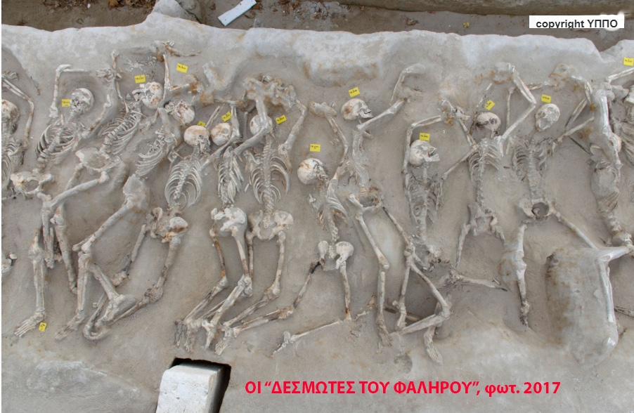 Δεσμωτες Φαληρου πολυανδριο Εσπλαναδα φαληρο δεσμωτης πολυανδρια εντυπωσιακο αρχαιο ευρημα 2016, ανασκαφη κατασκευη Κεντρο Πολιτισμου ιδρυμα Σταυρος Νιαρχος ΚΠΙΣΝ παλαιος παλιος ιπποδρομος σιδηροδεσμιος ανδρας δεμενος πισθαγκωνα δεμενοι θανατηφορο χτυπημα κεφαλι αρχαια εκτελεση ανασκαφες περιοδος πολιτικες αναταραχες πρωιμος 7ος αιωνας πΧ 6ος ταραχωδης εξεχον αρχαιολογικο ευρηματα κατα χωραν διατηρηση αναδειξη προστασια αποσπαση φθορα γεωλογια αρχαιολογικος χωρος αρχαιοτητα μουσειο Υπουργειο Πολιτισμου μοναδικο αρχαιολογια δεσμιος υπουργος Μενδωνη ομαδικη ταφη ανδρων, Μαρτιος ανθρωπινος σκελετος ολοσωμη αποσπαση αρχαια οστα Εφορεια Αρχαιοτητων Πειραιως και Νησων επαναφορα σκελετικα καταλοιπα ανδρας ανδρες