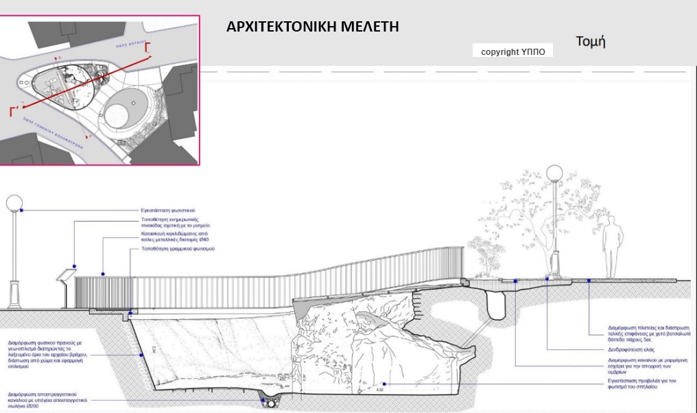 [2] Προκειμένου να δρομολογηθούν οι σχετικές εργασίες, ώστε να καταστεί επισκέψιμη κρίθηκε απαραίτητη η εκπόνηση σειράς μελετών όπως: Γεωτεχνική-υδρολογική, μελέτη συντήρησης του δομικών υλικών και ηλεκτρολογική μελέτη για τον φωτισμό του μνημείου. Το έργο αφορά στη δομική αποκατάσταση και στερέωση του σπηλαίου. Ως προς τα αρχιτεκτονικά μέλη, στο μαρμάρινο στηθαίο και στην πλακόστρωση της αυλής, προβλέπονται ήπιες επεμβάσεις, συμπληρώσεις, καθαρισμοί, συντήρηση και διαμόρφωση φυσικού καναλιού με υπόγειο αποστραγγιστικό σωλήνα, που να συνδέεται με το δημόσιο δίκτυο αποχέτευσης. Προβλέπεται, επίσης, η αποκατάσταση του περιβάλλοντος χώρου στη συμβολή των οδών Γενναίου Κολοκοτρώνη και Ανταίου, όπως η αναδιαμόρφωση του ανεσκαμμένου χώρου, με δημιουργία αναλημμάτων, περιμετρικής πορείας και πρόσθετων υποδομών καθώς και ο φωτισμός του χώρου καθώς παρεμβάσεις που θα συμβάλουν στην κατανόηση και ανάδειξη του μνημείου. Το έργο περιλαμβάνει την διαμόρφωση νέας πλατείας, στην οποία θα ενσωματώνεται ο αρχαιολογικός χώρος, με την αξιοποίηση του όμορου οικοπέδου, ώστε να εξασφαλίζεται ένας ευχάριστος, λειτουργικός και ποιοτικός δημόσιος χώρος περιπάτου και πρασίνου για τη γειτονιά και τον επισκέπτη.