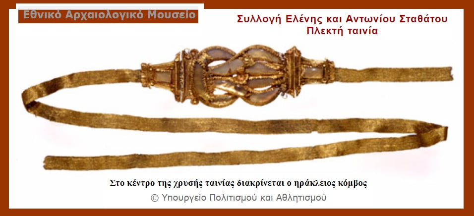 [1] Πανάρχαιο σύμβολον, γνωστό ως άμμα (ρ. απτω) και ως κόμβος του Ηρακλή. Το περιφημότερο δείγμα ευρίσκεται σε χρυσή πλεκτή ταινία, όπου ο ηράκλειος κόμβος είναι στολισμένος με ορεία κρύσταλλο! Από τον “Θησαυρό του Καρπενησίου”, στο Εθνικό Αρχαιολογικό Μουσείο Αθηνών (παραπάνω φωτ.).