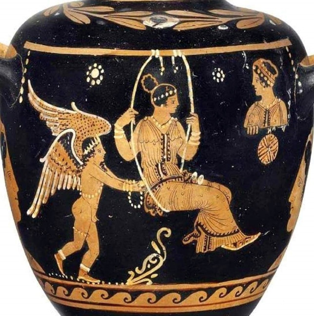 Σάτυρος γυμνός κουνάει κοπέλλα σε αιώρα.