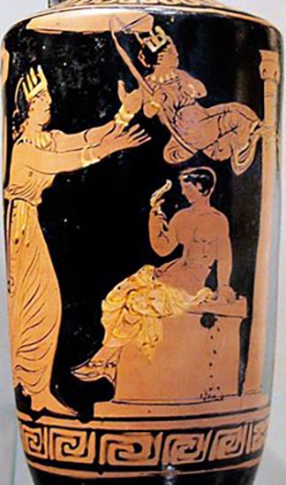 Βασίλισσα εστεμμένη κουνά την κόρη της, πριγκήπισσα, σε αιώρα, κάτω ακριβώς από έναν νέο. Από αρχαία λήκυθο.