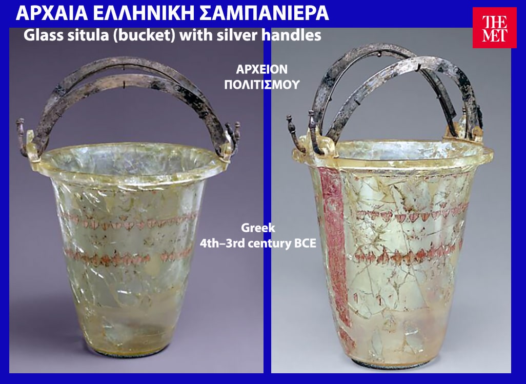 ΠΗΓΗ: “Glass situla (bucket) with silver handles – Greek late 4th–early 3rd century BCE”, Met / Metropolitan Museum of Art. ΑΡΧΕΙΟΝ ΠΟΛΙΤΙΣΜΟΥ, 3.1.2023.