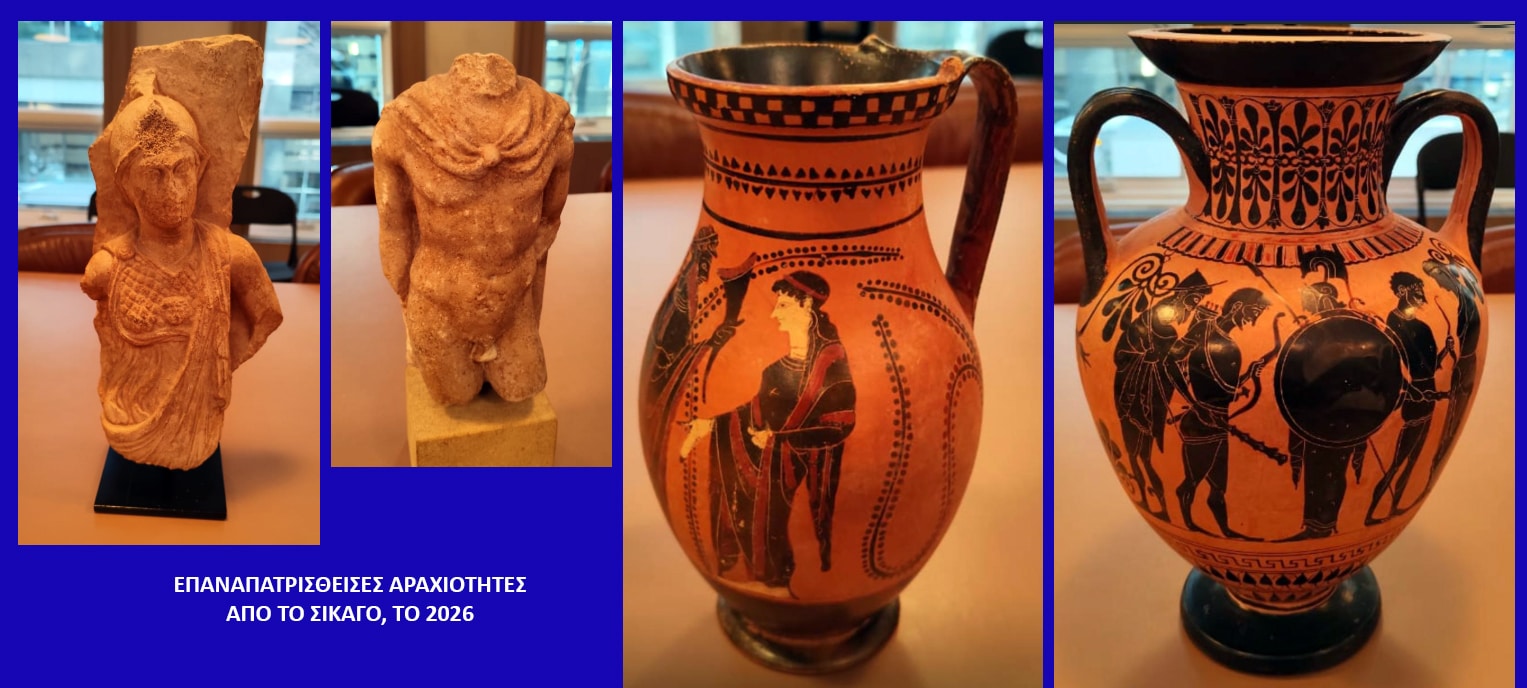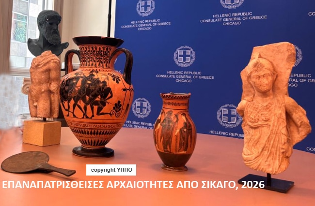 Η Υπουργος Πολιτισμού, Λ. Μενδώνη, παρέλαβε, σε ειδική τελετή, στο Γενικό Προξενείο της Ελλάδας, στο Σικάγο, πέντε αρχαιότητες, που επαναπατρίζονται από τις Ηνωμένες Πολιτείες. Πρόκειται για:
