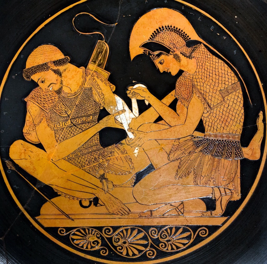 Ο Αχιλλέας (δεξιά, με κράνος) περιποιείται με ιδιαίτερη προσήλωση το αριστερό χέρι του αγαπημένου του φίλου, Πάτροκλου. Ο Πάτροκλος στρέφει το κεφάλι του με έκφραση πόνου, ενώ στηρίζει το σώμα του στην ασπίδα του. Λεπτομέρεια από το εσωτερικό ερυθρόμορφης κύλικας, έργο του Ζωγράφου του Σωσία. (Κρατικά Μουσεία Βερολίνου, Antikensammlung Berlin). Η συγκεκριμένη παράσταση θεωρείται μια από τις αρχαιότερες και πιο λεπτομερείς απεικονίσεις πρώτων βοηθειών στην παγκόσμια τέχνη. Χρήση επιδέσμου που τυλίγεται γύρω από τον βραχίονα και το δάκτυλο. Ο καλλιτέχνης αποδίδει με ακρίβεια την σωστή φορά της επίδεσης, η οποία συνάδει με τις ιπποκρατικές οδηγίες για την ακινητοποίηση τραυμάτων. Η εικόνα υπογραμμίζει ότι οι ήρωες της ομηρικής εποχής είχαν γνώσεις πρακτικής ιατρικής (χειρουργικής), μια παράδοση που εξελίχθηκε στην ορθολογική ιατρική των κλασσικών χρόνων.