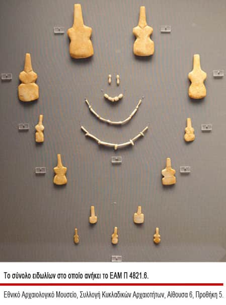 Ακόμα πιο εντυπωσιακό είναι το γεγονός ότι το ειδώλιο αυτό ξεχωρίζει ανάμεσα στα υπόλοιπα 13 μικρά μαρμάρινα πραγματικά σχηματικά ειδώλια, χωρίς εμφανή ένδειξη φύλου, τα οποία βρέθηκαν όλα, κοντά το ένα στο άλλο, ως κτερίσματα σε μία ταφή. Ίσως μάλιστα και τα 14 ειδώλια αντιπροσωπεύουν συμβολικά μια εκτεταμένη οικογένεια ή διαδοχή προγόνων.