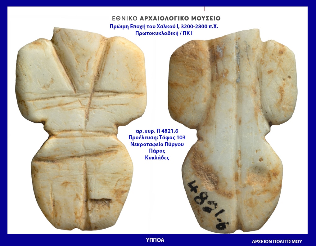 Ο λιθοξόος που πριν 5.000 χρόνια έδωσε μορφή στο μικρό λεπτό κομμάτι λευκού μαρμάρου των Κυκλάδων και δημιούργησε το σχηματικό ειδώλιο ανθρώπινης μορφής (ΕΑΜ Π 4821.6) της Πρώιμης Εποχής του Χαλκού Ι, είχε την ικανότητα να αποδώσει λεπτομέρειες, σχεδόν μικρογραφικά, με ελάχιστα εργαλεία. Αλλά ίσως ακόμη πιο σημαντικό είναι ότι οι λεπτομέρειες αυτές απηχούν τον προηγούμενο πολιτισμικό ορίζοντα της νεολιθικής περιόδου (6800 – 3200 π.Χ.)[1], ενώ προοιωνίζονται και την τεχνοτροπία των ειδωλίων της επόμενης περιόδου, της Πρώιμης Εποχής του Χαλκού II.